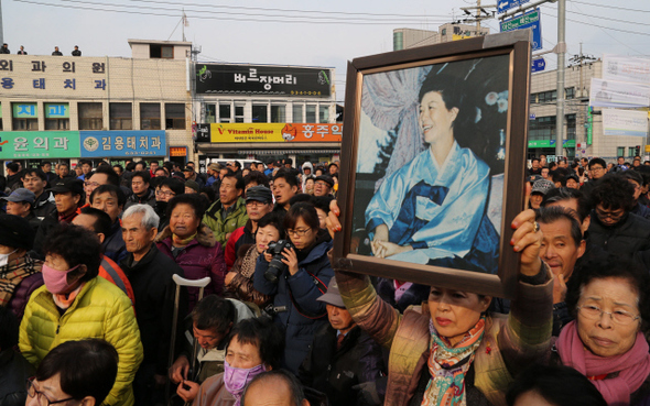 박근혜 새누리당 후보의 유세장에서 박정희 전 대통령의 부인 육영수씨의 사진을 든 노년층의 모습. 강창광 기자