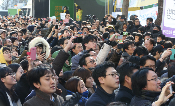 18대 대선 선거운동 기간에 문재인 민주통합당 후보의 유세장에서 휴대전화로 사진·동영상을 찍고 있는 젊은 층 이정우 선임기자