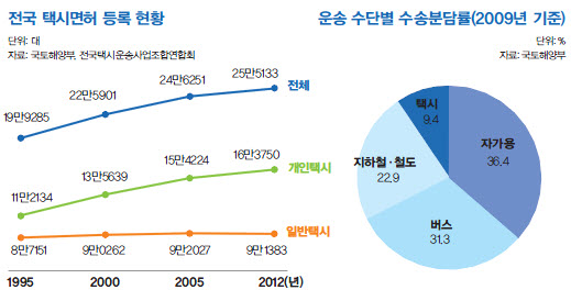 이처럼 격한 사회적 반대를 무릅쓰고 택시업계가 대중교통 수단 인정을 주장한 배경에는 오랫동안 지속돼온 택시업계의 불황이 자리잡고 있다. 지난해 12월 국토부가 발표한 ‘택시산업 발전 종합대책 추진계획(안)’을 보면, 지난 15년 동안 택시 수송 실적은 23% 감소했지만 오히려 면허 대수는 24% 늘어나 2011년 기준 29만4천여 명이 택시업에 종사하는 것으로 나타났다. 정부는 전체 택시 면허의 64%인 개인택시 면허에 대해 1970~80년대부터 2009년까지 꾸준히 양도·상속을 허용해 택시의 공급 과잉 상태를 낳아왔다. 현재 국토부는 전국 택시의 25%가량이 공급 과잉으로, 전국적으로 5만 대를 구조조정해야 한다고 보고 있다.