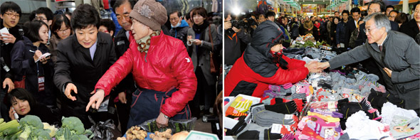 여야의 ‘실력 차이’는 중앙당 차원의 선거 전략뿐 아니라 일상적인 ‘생활정치’의 공간에서도 두드러졌다. 지난해 11월 14일 충북 청주의 한 재래시장을 찾은 새누리당 박근혜 후보(왼쪽)와 11월26일 같은 장소를 방문한 민주통합당 문재인 후보. 한겨레 강창광 기자, 사진공동취재단