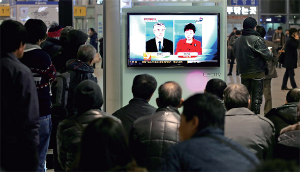 유권자들이 후보에게 투표할 때 ‘첫인상’으로 판단한다거나, 이성보다 감성이 더 큰 영향을 끼친다는 ‘신경정치학’이 관심을 끌고 있다. 18대 대선 때 서울역 대합실에서 유권자들이 후보들의 텔레비전 토론회를 보고 있다. 한겨레 김경호 기자