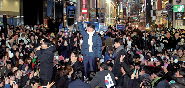 ‘안철수 지지자’ 가운데 문재인 민주통합당 후보에게 투표한 사람이 61%에 그쳤다는 조사 연구 결과가 나왔다. 안 전 후보가 2012년 12월18일 서울 명동에서 문 후보의 지원유세를 하고 있다. 한겨레 신소영 기자