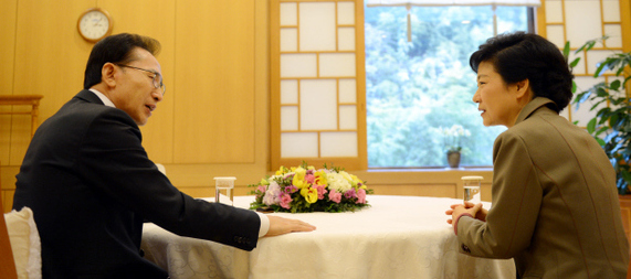 이명박 대통령과 박근혜 대통령 당선인이 2012년 12월28일 청와대에서 만나 대화하고 있다. 이후 이 대통령은 끝내 측근들에 대한 특별사면을 강행했고, 박 당선인 쪽은 “국민적 지탄을 받을 것”이라는 날선 반응을 내놨다. 두 사람의 악연은 이제부터가 진짜 시작인지 모른다. 청와대사진기자단