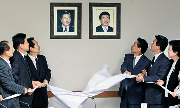민주당이 2009년 8월 서울 여의도 당사에 김대중·노무현 전 대통령의 사진을 거는 행사를 하고 있다. 두 대통령이 요즘 민주당을 본다면 무슨 말을 할까. 한겨레 김봉규 기자