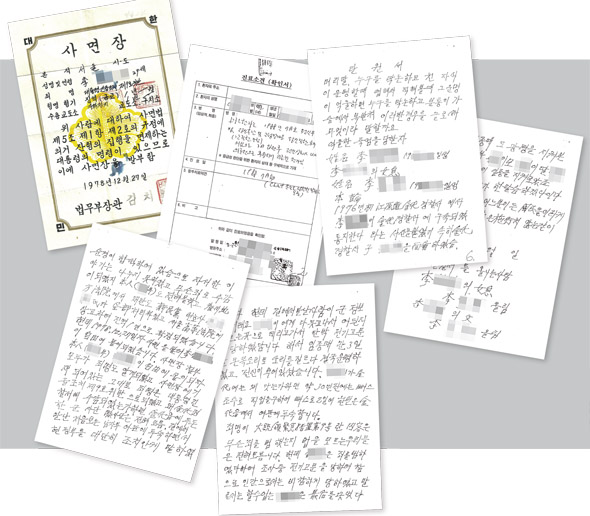 1977년 박정희 정권의 긴급조치 9호를 위반했다는 이유로 체포·구속된 이강현(가명)씨는 석방 10년 만인 1988년 고문 후유증으로 고통 속에서 사망했다. 윗줄 맨 왼쪽부터 시계 방향으로 이씨가 1978년 형집행정지로 풀려났을 때 법무부가 발부한 사면장, 사망 직후 이씨의 건강 상태를 증명해준 병원 진료확인서, 2000년 이씨의 아버지가 아들의 억울한 죽음을 호소하며 작성한 탄원서.