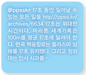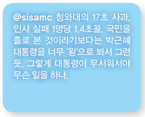 [%%IMAGE3%%]지난주 트위터는 ‘17초 대독 사과’로 뜨 거웠다. 허태열 청와대 비서실장의 명의로 김행 대변인이 ‘대독’한 대국민 사과문이 오히려 국민을 우롱하는 처사라는 지적이 었다. 사과를 하려면 물의를 일으킨 당사 자가 나와서 해야 한다. 사과의 내용을 보 면 사과를 해야 할 당사자를 알 수 있을 텐 데, 인사 난항에 따른 혼란을 사과하는 것 이었다.