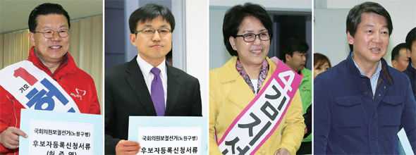 서울 노원병 선거는 ‘여 1, 야 3’ 구도로 짜였다. 허준영 새누리당 후보, 정태흥 통합진보당 후보, 김지선 진보정의당 후보, 안철수 무소속 후보(왼쪽부터)가 4월4일 서울 노원구선거관리위원회에 후보 등록을 하러 들어서고 있다. 한겨레 이정우 기자
