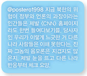 문제는 북한이 얻으려는 것을 외부에 관철 하는 과정에서 산발적인 국지전이 벌어질 가 능성이 생각보다 높아 보인다는 데 있다. 김정 은이 아직 군부를 완전히 장악하지 못했다는 가정하에, 그의 비전이 어떻든 간에 관계없이 갈등이 고조되면 실질적인 충돌의 기회도 늘 어난다. 단 한 번의 국지전이라도 상당한 희 생자가 뒤따를 것이다. 국가의 존망을 건 북 한의 강수에 남북이 공히 살얼음판 가운데로 내몰리는 상황이다. 과장된 음모론의 유희에 빠져들지도, 상황을 축소하거나 확대해석해 유언비어를 남발하지도 말아야 한다. 생각보 다 훨씬 중요하고, 위험한 시기다. 허지웅 영화평론가 부조리에 대처하는 심성의 리얼리즘 미디어의 위기감 조장에도 평온하기만 한 시민 일상 60년 정전체제가 빚은 냉소와 공포의 분열적 이중주