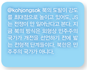 나를 포함해 많은 사람들이 이번 북핵 위 기를 실재하는 위협으로 인식하지 못하는 것 같다. 도발은 잦았고 거짓말 일색이었으 며 위협의 논조는 언제나 강했다. 상식적인 대화 상대로 참아내기에 지나치게 예측 불가 한 존재였다. 흡사 1992년의 휴거 소동 이후 유사한 종말론이 제기되더라도 국내에선 해 외만큼의 반향을 얻지 못했던 것처럼 북핵 위기 또한 그랬다. 그러나 이번에는 확실히 흘러가는 양상이 다르다. 북한이 실제 전쟁 을 불사할 의지가 있는지는 아무도 모른다. 하지만 북한이 무엇을 얻고자 하는지는 합리 적인 추측이 가능하다.