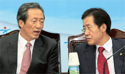 말이 나왔으니 말인데, 진짜 스토커는 이분들이 아닐까요? 무주공산인 ‘보수의 아이콘’의 지위를 선점하려고 무리수를 거듭하는 중견 정치인들 이야기예요. 왜 이러는 걸까요. 아무도 ‘차기감’으로 알아주지 않기 때문인가요. 우선 정몽준 새누리당 의원님. 모처럼 미국까지 날아가 한국 정부의 핵확산금지조약(NPT) 탈퇴와 독자적인 핵무장을 주장하셨죠. 한때 보수당 대표까지 지냈던 분의 말씀이라기엔 위험천만해 보여요. 뭐가 뛰니까 뭐도 뛴다고, 원유철 새누리당 의원은 “우리도 북한이 핵을 폐기하면 즉각 함께 폐기하는 조건부 핵무장을 해야 한다”고 맞장구를 쳤어요. 혹시라도 ‘정몽준 대통령’이 탄생하면 ‘원유철 국방부 장관’쯤 되시려나. ‘전략’도 없어 보이고 별로 ‘특별’해 보이지도 않건만 이분은 새누리당의 무려 ‘북핵안보전략특별위원회’ 위원장님이군요.