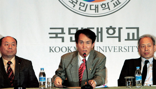 지난해 4월20일 서울 정릉동 국민대 본부관에서 이채성 국민대 연구윤리위원장(가운데)이 문대성 의원의 논문 표절 의혹과 관련한 예비조사 결과를 발표하고 있다. 이날 국민대는 “논문 표절 가능성이 높다”고 했으며, 그로부터 8개월 뒤인 지난해 12월19일에는 “논문 표절이 맞다”는 본조사 결과를 공개했다. 한겨레 신소영 기자