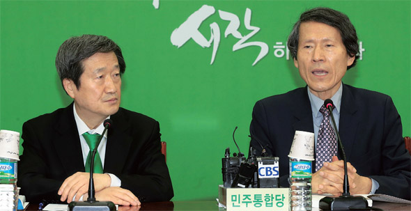 민주통합당 대선평가위원회가 내놓은 대선 평가 보고서가 계파갈등의 대상으로 전락했다. 4월9일 한상진 대선평가위원장(오른쪽)과 김재홍 간사위원이 보고서를 발표하고 있다. 한겨레 이정우 기자