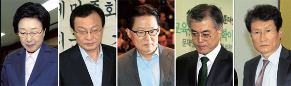 이들이 보여줘야 할 ‘정치적 책임윤리’는 무엇일까. 민주통합당 대선 평가 보고서에는 대선 패배의 ‘정치적 책임’을 져야 할 인사들의 실명과 ‘책임 점수’가 적시됐다. 왼쪽부터 한명숙 전 대표, 이해찬 전 대표, 박지원 전 원내대표, 문재인 전 후보, 문성근 전 대표대행. 한겨레 박종식 기자, 강창광 기자, 신소영 기자, 이정우 기자