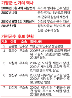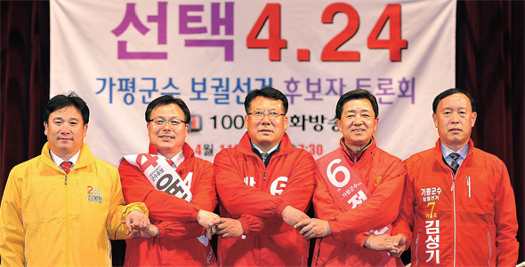빨간 후보 4명과 노란 후보 1명이 경쟁하고 있었다. 4월24일 재·보궐 선거에서 군수를 다시 뽑는 경기도 가평군 얘기다. 기호 1번 후보는 없다. 새누리당이 박근혜 대통령의 기초자치단체 정당공천 폐지 공약에 따라 후보를 내지 않았기 때문이다. 반면 민주통합당은 문재인 대선 후보의 공약을 깨고 기호 2번 후보를 공천했다. 민주당이 가평군수 선거에 후보를 낸 것은 무려 11년 만이다. 가평군 유권자(5만 명)들은 ‘새누리당 코스프레’를 하는 무소속 후보 4명과 ‘처음 나온 민주당 후보’ 1명의 ‘이상한 싸움’을 지켜보고 있었다. 새로 뽑힐 군수의 임기는 2014년 6월4일 동시지방선거까지 1년 남짓이다.