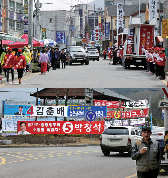 지난 4월16일 오전 경기도 가평군 설악면 신천리 설악장터에서 군수 보궐선거 후보들의 선거운동이 한창이다. 도의원 2명이 중도사퇴하는 바람에 도의원 보궐선거도 함께 치러진다. 설악면사무소 로터리에 후보자들의 펼침막이 걸려 있다. 한겨레 김명진 기자