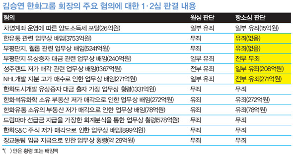 한화 쪽에도 성과는 있었다. 항소심 재판부는 김 회장의 사건이 회삿돈을 횡령하거나 비자금을 조성해 개인적으로 착복한 다른 재벌 총수의 사례와는 다르다고 인정했다. 그러나 엄연히 위법행위를 저지른 만큼 “계열사 내부의 부실을 정리하려는 정상적인 구조조정의 한 과정”이라는 한화 쪽의 주장을 받아들이지 않고 업무상 배임죄를 적용했다.