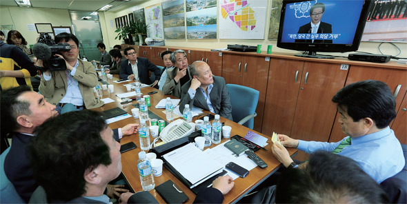 4월26일 오후 개성공업지구 입주기업 대표들이 서울 무교동 입주기업협회 사무실에서 개성공단 잔류 인원 전원 철수 결정을 뼈대로 한 류길재 통일부 장관의 성명 발표 모습을 텔레비전을 통해 지켜보고 있다. 사진공동취재단