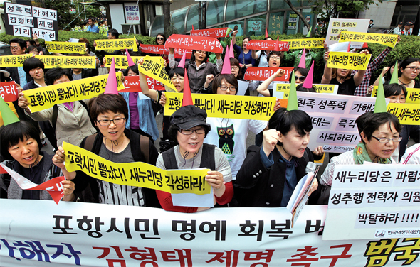 포항범시민대책위원회 회원들과 한국여성단체연합 회원들이 2012년 5월11일 오후 서울 여의도 새누리당 당사 앞에서 친족 성폭력 가해 의혹을 받고 있는 김형태 국회의원 당선자의 사퇴 및 제명을 촉구하고 있다. 한겨레 신소영 기자