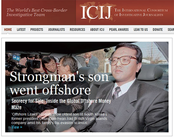 전재국씨가 국제탐사보도언론인협회(ICIJ) 누리집 대문에 등장했다. ICIJ는 승용차에 앉아 있는 그의 모습을 배경으로 “독재자의 아들은 역외로 갔다”는 문구를 걸었다.