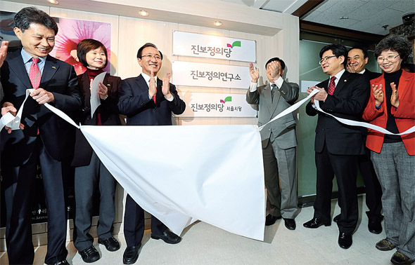 진보정의당이 ‘진보’자를 떼어내는 당명 개정을 추진하고 있다. 지난 2월5일 서울 여의도 동아빌딩 진보정의당 새 당사에서 열린 현판식. 한겨레 김봉규 기자
