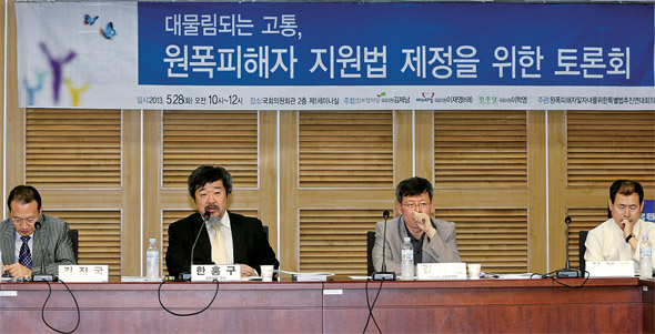 형률씨가 한국인 원폭 피해자와 그 2세들의 생존권 보장을 촉구하는 진정서를 국가인권위원회에 낸 것은 벌써 10년 전인 2003년 8월이다. 이를 근거로 인권위는 이듬해 5개월에 걸친 실태조사에 들어갔다. 국가기관이 원폭 피해자에 대한 실태조사를 벌인 것은 이때가 처음이다. 인권위는 2005년 2월 “원폭 피해자 1세와 2세 모두 비피폭자에 견줘 질병 발생 위험도가 매우 높은 것으로 나타났다”는 조사 결과를 발표했다. 그로부터 석 달 남짓 만에 형률씨는 마지막 가쁜 숨을 몰아쉬었다. 그해 8월 민주노동당 조승수 의원(울산 북구)의 대표발의로 원폭 피해자 지원을 위한 특별법이 발의됐다. 하지만 법안이 해당 상임위(보건복지위원회)에 계류된 채 17대 국회의 임기가 끝났다. 2008년 11월 한나라당 조진래 의원(경남 의령·함안·합천) 등 103명이 다시 특별법을 공동 발의했다. 이 역시 상임위를 통과하지 못한 채 18대 국회가 끝났다. 8년 세월을 허송한 게다. 이번엔 다를까? 5월28일 토론회에서 사회를 맡은 한홍구 성공회대 교수는 이렇게 지적했다. “이념의 문제가 아니다. 인권 문제일 뿐이다. 수천 명의 피폭 생존자들의 고통과 한을 언제까지 두고만 볼 것인가. 피폭 1세는 대부분 고령이고, 2세는 각종 질병으로 건강이 위태롭다. 시간이 촉박하다.” 정인환 기자 inhwan@hani.co.kr