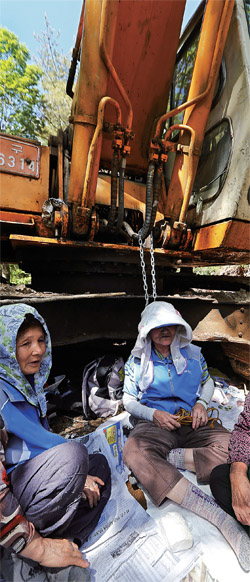 송전탑 건설을 반대하는 주민들이 지난 5월21일 경남 밀양시 단장면 바드리 89번 송전탑 공사 현장에서 쇠사슬로 포클레인과 몸을 묶고 공사를 저지하고 있다. 한겨레 김명진 기자