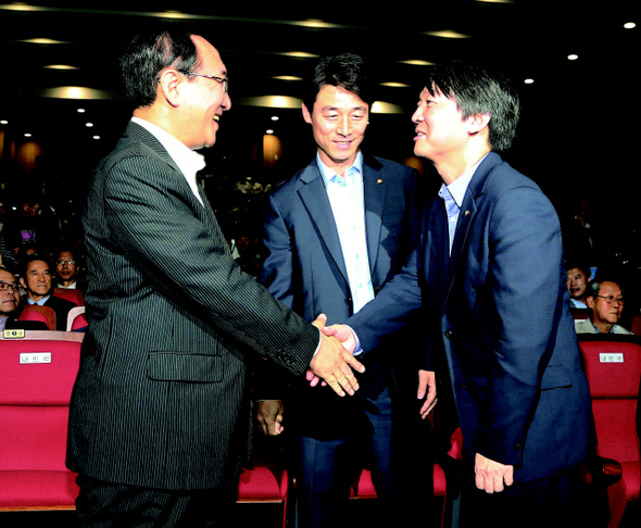 ‘진보적 자유주의’를 정치 이념으로 내건 안철수 세력과 ‘사민주의’를 채택할 예정인 진보정의당의 연대론이 불거지고 있다. 지난 6월19일 ‘정책네트워크 내일’ 창립 심포지엄에서 안철수(오른쪽)·송호창(가운데) 의원이 노회찬 진보정의당 공동대표와 인사하고 있다.한겨레 이정우