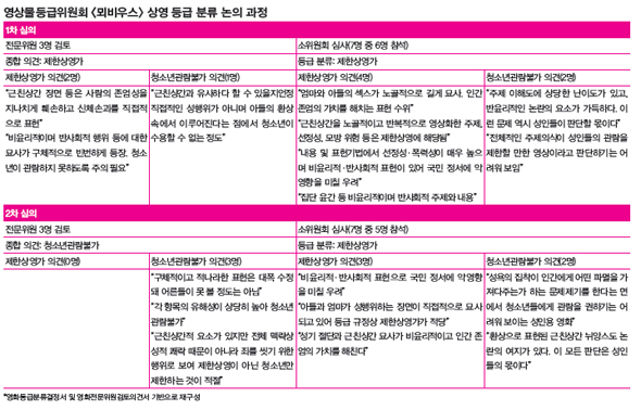 4:2 혹은 3:2. 다수결에 따라 제한상영가 등급이 결정됐지만, 위원들 사이에도 작품을 바라보는 시각차는 컸다. 특히 일부 장면 삭제 뒤 이뤄진 재심의 과정에서, 본심인 소위원회가 열리기 전 작품을 사전 검토한 전문위원 3명은 만장일치로 <뫼비우스>에 대해 청소년관람불가 등급 의견을 제시한 사실이 확인됐다. 지난해 9월 영등위는 등급분류 심사 기간을 단축하기 위해 ‘절차 경량화’ 제도를 도입했다. 영화 제작사가 ‘전체 관람가’나 ‘청소년관람불가’ 등급을 희망하고, 전문위원들의 평가도 이와 동일한 경우 등급 분류 절차를 간소화했다. 소위원회에서 영화를 따로 평가하지 않고 전문위원 의견에 동의하는 방식이다. 김기덕필름은 청소년관람불가 등급을 희망했고, 전문위원들도 같은 의견이었으므로 <뫼비우스>도 청소년관람불가 등급을 받게 될 가능성이 높았다. 그러나 7월15일 열린 소위원회에서는 <뫼비우스>를 다시 평가했다. 평소 관행에 비추어 이례적인 일이었다. 안치완 영등위 정책홍보부장은 “소위원회 참석위원 과반수가 이의를 제기하는 경우 절차 경량화 대상에서 제외하는 규정이 있다”며 “이에 따라 소위원회가 제한상영가 등급 결정을 내린 것”이라고 설명했다. 이날 회의에는 위원 7명 중 5명이 참석했다. 제한상영가 등급 의견을 낸 위원은 3명, 청소년 관람불가 의견을 낸 위원은 2명이었다(자세한 내부 논의 내용은 표 참조).