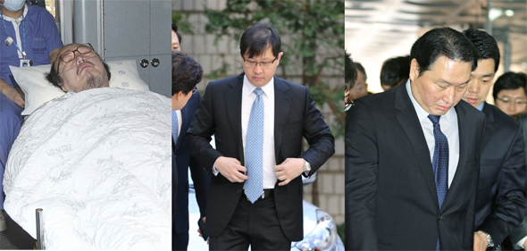 지난 4월 구급차에 실려 법원에 출두하고 있는 김승연 한 화그룹 회장(맨 왼쪽), 지난 9월27일 서울 서초동 서울고법 의 항소심 선고공판에 들어가고 있는 최재원 SK그룹 부회 장(가운데), 지난 1월 1심 선고공판에 출석하기 위해 서울 중앙지법으로 들어가는 최태원 SK그룹 회장(맨 오른쪽).