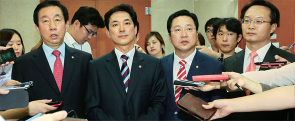 새누리당 소속 김성태·박민식·이장우·조해진 의원(왼쪽부터)이 10월1일 오후 서울 여의도 국회 정론관에서 서청원 전 한나라당 대표의 재보선 공천 반대 기자회견을 마치고 기자들의 질문을 받고 있다. 이들은 “박근혜 대통령이 대표 시절 얼마나 가혹한 공천 기준을 적용했느냐”며 서 전 대표 공천의 부당함을 역설했다.