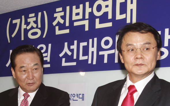2008년 3월19일 서청원 전 한나라당 대표(왼쪽)와 홍사덕 전 의원이 한나라당 탈당 및 ‘친박연대’(당시 이름 미래한국당) 입당 기자회견을 하고 있다. 서 전 대표와 홍 전 의원은 비리 경력으로 떠나야 했던 ‘박근혜 진영’에 최근 국회의원 재보선 후보(경기 화성갑)와 민족화해협력범국민협의회 대표상임의장으로 각각 복귀했다.