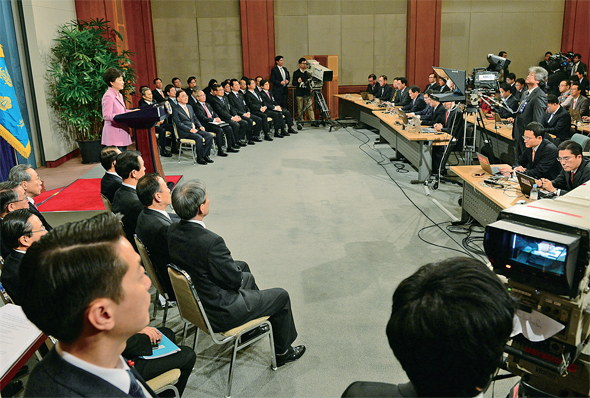 명단을 보고 의아했을 법도 한데, 클럽을 통해 참석한 일본 기자들은 청와대에 도착해서야 ‘질문권’이 없다는 사실을 공식 통보받았다. 일부 기자들은 분통을 터뜨렸다. “회견 직전 일부 일본 기자들이 항의했다. 회견에서도 손을 들어 질문을 하려 했으나 묵살당했다.”(<지지통신> 1월6일) 다만 한 국내 기자가 한-일 관계에 대해 질문한 덕에 일본 기자들은 그나마 쓸거리는 챙겼다. 박 대통령은 “양국 협력이 확대되어나가야 할 중요한 시기인데, 이러한 협력을 할 수 있는 환경이 자꾸 깨지는 일이 반복되고 있어서 저는 이 점을 안타깝게 생각합니다”라는 등 일본의 태도 변화를 촉구하는 기존 입장을 재확인했다.