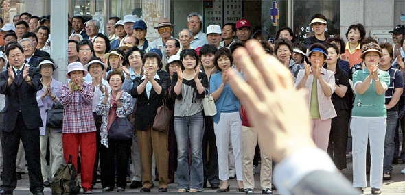 6·4 지방선거를 앞두고 각종 여론조사 결과가 쏟아져나오고 있다. 후보들은 민감해하고, 유권자들은 혼란스러워한다. 얼마나 믿어야 할까. 유권자들이 선거 유세를 들으며 박수를 치고 있다.윤운식