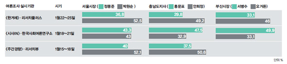 최근 발표된 부산시장 여론조사 결과를 보자. 오거돈 전 해양수산부 장관을 안철수 신당 소속으로 가정하고 서병수 새누리당 의원과 가상 양자 대결을 붙인 결과, <한겨레>·리서치플러스 조사에서는 오 전 장관(46%)이 서 의원(33.1%)을 크게 앞섰다. <시사IN>·한국사회여론연구소 조사에서는 거꾸로 서 의원(49.9%) 지지율이 오 전 장관(33.1%)보다 훨씬 높았다. 서울시장과 충남도지사 선거 여론조사 결과(표 참조)도 들쭉날쭉하기는 매한가지다. 광주시장 민주당 후보 자리를 놓고 이용섭 의원과 경쟁하는 강운태 시장은 지난 1월 말 이 의원이 큰 격차(13.4%포인트)로 앞선다는 <프레시안>·더플랜의 조사 결과 보도에 대해 선거관리위원회에 이의 제기를 하기도 했다. 다른 조사에서는 대부분 자신이 앞섰다는 이유에서다.