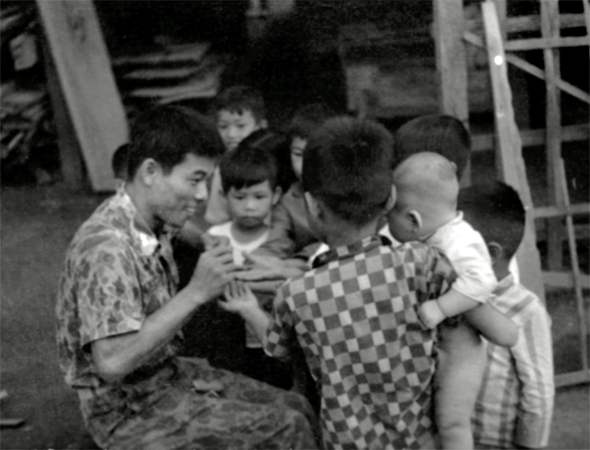 1968년 봄 어느 날, 최영언 중위가 호이안 시내에서 베트남 아이들에게 시레이션 상자에서 가져온 사탕과 비스킷을 나눠주고 있다. 아직도 많은 중부지방의 베트남 사람들은 이렇게 민간인들에게 친절하던 한국군의 모습을 기억한다. 그래서 더더욱 민간인 학살 사건에 관해 의아해한다.최영언 제공