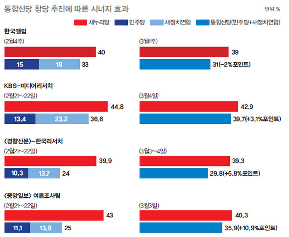 한귀영 - 안철수 지지층이 어떻게 할지도 관심사다. 여론조사에서는 대체로 통합신당이 7~8%포인트의 시너지 효과를 얻었다고 나온다. 나는 아직 제한적이라고 본다. 대선 때 문재인 민주당 후보를 지지한 48% 가운데 아직 반신반의하는 사람이 많다. 안 의원을 지지했던 중도보수층이 이탈할 거라는 얘기도 하는데, 그건 오히려 적을 걸로 본다. 안철수 지지층 가운데 88%가 통합신당으로 갔다면, 여론조사에서 그 정도 차이는 거의 다 간 것으로 간주된다. 최근 한겨레사회정책연구소의 여성 유권자 여론조사 결과를 보면, 정책 이슈에서 안철수 지지층은 민주당과 한 집단으로 묶인다. 경제·사회·환경 이슈는 물론 안보도 다르지 않다. 두 세력이 합치면 안철수 지지층이 이탈하기보다는 모이는 효과가 더 클 것으로 본다. 안 의원이 그동안 자신의 지지층이 중도보수라고 했는데, 사실은 그렇지 않다.
