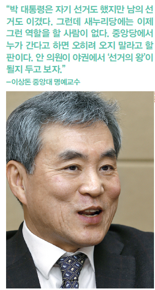 이상돈 - 그때와 다른 것도 있다. 당시엔 한나라당이 완전히 어려웠다. 지금 민주당은 어쨌든 멀쩡하잖나? 당시 한나라당은 개헌 저지선을 내줄지 모른다는 절박함이 있었고, 박 대통령은 기본적으로 아버지와 지역이 있다. 안 의원과 박 대통령이 같은 것도 있다. 대중성이다. 박 대통령은 자기 선거도 했지만 남의 선거도 이겼다. 안 의원이 이번에 자신을 버리고 박원순 시장이 이기도록 발 벗고 뛰는 식으로 가면 새누리당에 굉장히 큰 위협이 될 거다. 새누리당에는 이제 그런 역할을 할 사람이 없다. 중앙당에서 누가 간다고 하면 오히려 오지 말라고 할 판이다. 안 의원이 야권에서 ‘선거의 왕’이 될지 두고 보자.