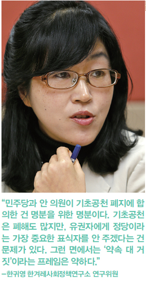 한귀영 - 민주당과 안 의원이 기초공천 폐지에 합의한 건 명분을 위한 명분이라고 생각한다. 기초공천은 폐해도 많지만, 유권자에게 정당이라는 가장 중요한 표식자를 해체하는 건 문제가 있다. 그런 면에서는 ‘약속 대 거짓’이라는 프레임은 설득력이 약하다.