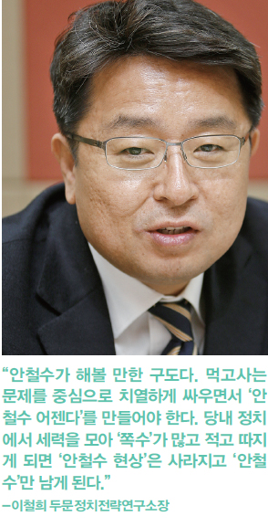 - 민주당은 보약을 먹어야 할 형편인데, 안 의원만 한 보약이 없었다. 민주당 누구라도 지방선거까지 안 의원에게 뭐라 들이대긴 어렵다. 지방선거 이후 친노·비노 구도가 된다 해도 안 의원에게는 나쁘지 않다고 본다. 비노 쪽도 상당한 세가 있고, 차기 주자로 구심점이 필요하다. 친노 쪽도 바깥의 안철수보다 내부의 안철수와 싸우는 게 낫다. 안 의원이 해볼 만한 구도다. 정치의 주제를 바꾸는 게 핵심 과제다. 상대를 부정하는 문제 말고, 먹고사는 문제를 중심으로 치열하게 싸우는 식으로 정치의 주제를 바꾼다면, 그걸 중심으로 ‘안철수 어젠다’가 만들어진다면, 그게 리더십이다. 당내 정치에서 세력을 모아 ‘쪽수’가 많고 적고 따지게 되면 ‘안철수 현상’은 사라지고 ‘안철수’만 남게 된다.