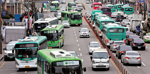 경기도 안양의 거리를 버스와 승용차들이 뒤엉켜서 달리고 있다. 경기도의 교통분담률이 승용차(47.8%)가 가장 높고 버스(29.8%)와 철도(9%)가 그 뒤를 잇는다. 이 때문에 경기도지사 선거 때마다 후보들이 내놓는 교통정책에 큰 관심이 쏠린다.한겨레 김경호
