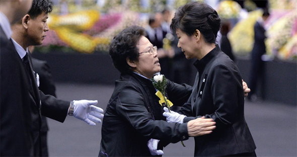 박근혜 대통령이 지난 4월29일 세월호 참사 분향소에서 조문을 온 할머니와 만나고 있다. 시민들은 청와대가 일반 조문객 할머니를 유족으로 가장해 사진 촬영을 연출했다고 의심했다. 이런 의심은 정부를 향한 불신이 얼마나 큰지를 보여준다.청와대사진기자단