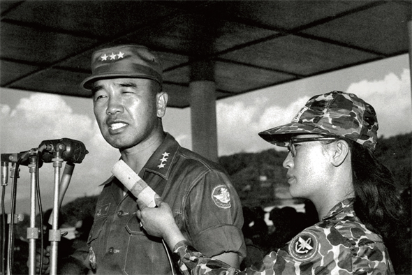 1967년 7월22일 베트남 중부 냐짱 근처 닌호아의 백마사단에서 열린 사단장 이·취임식에 참석해 연설하는 채명신 주월한국군사령관. 그는 자신이 “100명의 베트콩을 놓치는 한이 있어도 1명의 양민을 보호하라”는 슬로건을 개발했다고 늘 자랑 삼아 말했지만, 실제 슬로건대로 실천됐는지는 잘 알지 못했다. 대한민국정부기록사진집