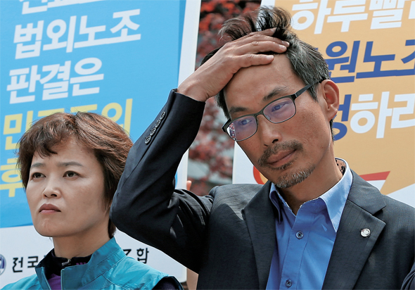 지난 6월19일 서울행정법원이 “전교조에 대한 노동부의 ‘법외노조’ 통보는 정당하다”는 판결을 내린 뒤 김정훈 전교조 위원장 등 전교조 간부들이 판결 내용을 반박하는 기자회견을 열고 있다. 한겨레 신소영