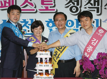 동작을에선 여당 후보는 1명이지만 야권 후보는 4명이 나왔다. 기동민(새정치민주연합)·유선희(통합진보당)·노회찬(정의당)·김종철(노동당) 후보(왼쪽부터)가 7월14일 정책선거협약식에서 선의의 경쟁을 다짐하고 있다. 한겨레 이정우 선임기자