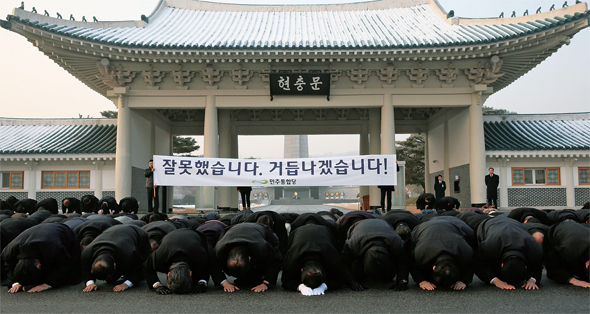 민주당 소속 의원들이 2013년 1월14일 18대 대선 패배의 책임을 통감한다며 서울 동작구 국립현충원의 맨바닥에 엎드려 참회의 3배를 하고 있다. 이후 찬 바닥에서 절한 냉기가 무릎에서 사라지자, 민주당 의원들은 당 외부 인사가 제안한 당 혁신안도 제대로 실천하지 않았다. 한겨레 이정우 선임기자