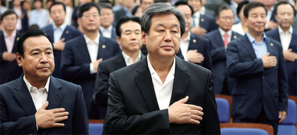 김무성 새누리당 대표(오른쪽)가 8월1일 국회에서 열린 새누리당 의원총회에서 국민의례를 하고 있다. 한겨레 김경호 기자