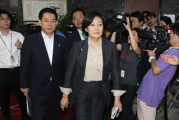 박영선 새정치민주연합 원내대표(왼쪽)가 지난 8월11일 서울 여의도 국회 운영위원장실에서 열린 세월호 특별법 여야 회담을 마치고 나오면서 취재진의 질문에 답변하고 있다. 이완구 새누리당 원내대표(왼쪽)도 회담을 마친 뒤 운영위원장실을 나가고 있다. 공동취재사진