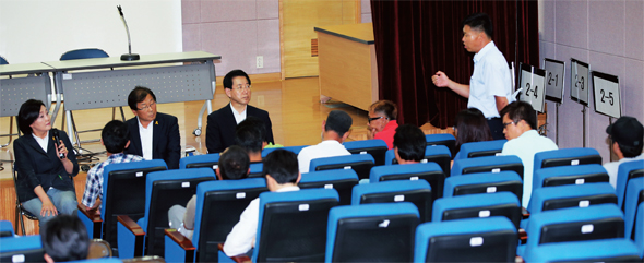 박영선 새정치민주연합 원내대표(맨 왼쪽)가 지난 8월20일 경기도 안산 합동분향소 뒤에 있는 도립미술관에서 유족들에게 협상 과정을 설명하며 이해를 구하고 있다. 한겨레 김태형 기자