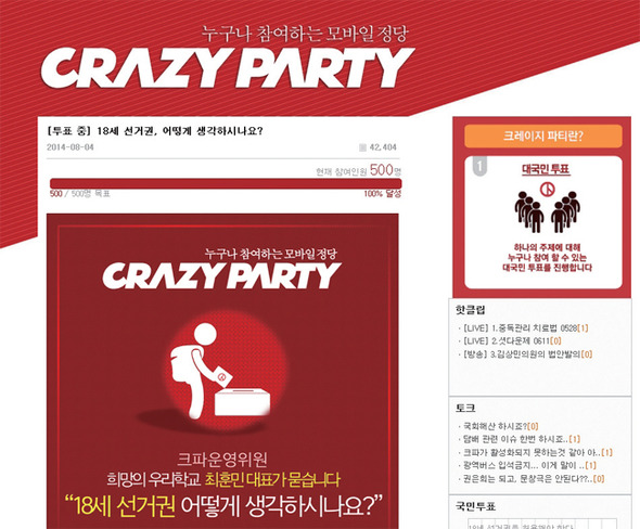 새누리당에 크레이지 파티를 제안했던 조동원 전 새누리당 홍보기획본부장은 “(휴대전화에서 메시지를 주고받는) ‘카카오톡’에 익숙한 시민들은 즉각적인 소통과 빠른 반응을 원한다. 크레이지 파티는 국민들이 청원하는 정책을 정치권에서 빠르게 해결할 수 있도록 연결해주는 대행 서비스라고 할 수 있다”고 설명했다. 나흘, 주제 선정해 투표 뒤 장관 답변까지 크레이지 파티가 처음 진행한 사안은 만 16살 미만의 청소년들이 밤 12시부터 아침 6시까지 인터넷 게임에 접속할 수 없도록 규제한 ‘강제적 셧다운제’의 실효성에 대한 찬반투표였다. 찬반투표에서 일방적인 셧다운제가 청소년들의 자율성을 침해한다는 의견이 높게 나오자, 새누리당은 김상민 의원을 통해 ‘청소년보호법’에서 강제적 셧다운제 조항을 삭제하는 개정안과 함께 청소년의 인터넷 게임 몰입(중독) 문제에 대한 예방책을 강화하는 ‘게임산업 진흥에 관한 법률 개정안’을 같이 제출했다. 이어 크레이지 파티는 수도권 광역버스의 입석 승차를 금지하고 이를 어긴 승객 등을 단속하는 방침에 대해 시민들의 불만이 나오자, 홈페이지에서 ‘광역버스 입석금지 단속’ 찬반투표를 진행했다. 입석 금지 유보 의견이 88%에 이르자, 새누리당은 세종시 정부청사에서 서승환 국토교통부 장관에게 이런 불편 사항을 공식 제기했고, 서 장관은 “시민 불편에 대한 대책이 마련될 때까지 단속을 유예하겠다”고 밝혔다. 크레이지 파티에서 ‘광역버스 입석 금지 단속’ 주제를 선정해 찬반투표를 벌여 장관 답변까지 얻어내는 데 나흘밖에 걸리지 않았다. 조동원 전 본부장은 “광역버스 문제는 크레이지 파티의 (빠른 소통 구조 장점을 보여주는) 대표적인 사례”라고 말했다. 크레이지 파티는 최근 세 번째 사안으로 만 19살 이상 국민에게만 선거권을 주는 현행 제도를 고쳐 ‘18살 청소년부터 선거권(투표할 수 있는 권리)을 허용해야 한다’는 내용을 놓고 찬반투표를 벌였다. 선거권 연령을 낮추는 문제는 새누리당 의원들 사이에서도 이견이 많지만, 크레이지 파티에서 이 사안을 공개적인 논의의 장에 올려놓은 것이다. 최근 스코틀랜드는 영국에서 독립하는 안에 대한 국민투표에서 16살 청소년에게도 투표권을 부여했고, 독일 지방의회 선거에선 이미 선거권이 16살로 낮아지는 등 18살 이하 청소년에게도 선거권을 주는 것이 국제적 흐름이다. 크레이지 파티도 “해외에서는 선거연령을 18살 이하로 대부분 정하고 있다. 선거연령을 19살 이상으로 정한 나라는 우리나라가 세계에서 유일하다. 우리나라는 도로교통법, 병역법, 국가공무원법 등에서 18살 청소년들이 운전, 입대, 공무원을 할 수 있도록 규정하고 있다. 18살 청소년들에게 자동차 핸들과 총도 쥐어주면서 선거권은 쥐어주지 않고 있다”고 이 주제를 제안한 배경을 설명하며 투표를 진행했다. 투표 참여 인원을 500명으로 제한한 찬반투표에서 ‘18살 선거권을 허용해야 한다’에 찬성한 비율이 61.8%(309명)로 나타났다. 이런 결과를 반영해 새누리당은 김세연 의원을 통해 선거권 연령을 낮추는 법안 발의를 준비하고 있다. “2등이 할 일을 1등이 하고 있는 것” 크레이지 파티가 아직 초창기에 불과하고 인터넷 여론을 정책으로 반영할 때 좀더 신중한 여과장치가 필요하다는 반론이 있지만, 새누리당의 실험을 의미 있게 보는 평가도 나온다. 안병진 경희사이버대 부총장은 “새누리당의 크레이지 파티는 (위기에 빠진) 새정치연합에서 먼저 해야 하는 것이었다. 상호작용의 시대에서 시민을 주체로 세우고, 시민과 상호작용하는 것이 중요해졌기 때문이다. 새누리당이 ‘1등에 머무르려면 2등(도전자)처럼 생각하라’는 (혁신 컨설턴트) 애덤 모건의 조언을 충실히 이행하고 있는 것처럼 보인다. 새누리당의 모바일 정당 구축 등이 바로 2등이 할 일을 1등이 하고 있는 것”이라고 평했다. ‘문희상 비대위 체제’에서 다시 당 혁신 과제를 만들기 위해 정치혁신실천위원회를 띄운 새정치연합은 당원 기반을 튼튼히 다지는 것을 넘어 시민과 소통력을 키우는 정당으로 체질을 바꿀 수 있을까? ‘남의 집 사정’을 바라보는 조동원 전 본부장의 얘기다. “미디어(온라인) 환경은 빠른 속도로 바뀌고 있다. 정치도 국민들과 의사소통을 빠르게 할 수 있는 시스템으로 바뀌어야 하지 않겠느냐. 그런데 (새정치연합이) 우리 계파, 세력에게 ‘어떤 정당 시스템이 이익이 될까’란 정치적 유불리로만 바라보게 되면 네트워크 정당이니 모바일 정당 같은 것은 할 수 없을 것이다.” 송호진 기자 dmzsong@hani.co.kr