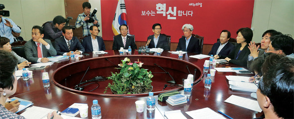 지난 10월6일 김문수 새누리당 보수혁신특별위원회 위원장(가운데)이 서울 여의도 당사에서 열린 특위 3차 회의에서 국회의원의 불체포특권 개혁 방안에 대해 논의하고 있다. 한겨레 김경호 기자